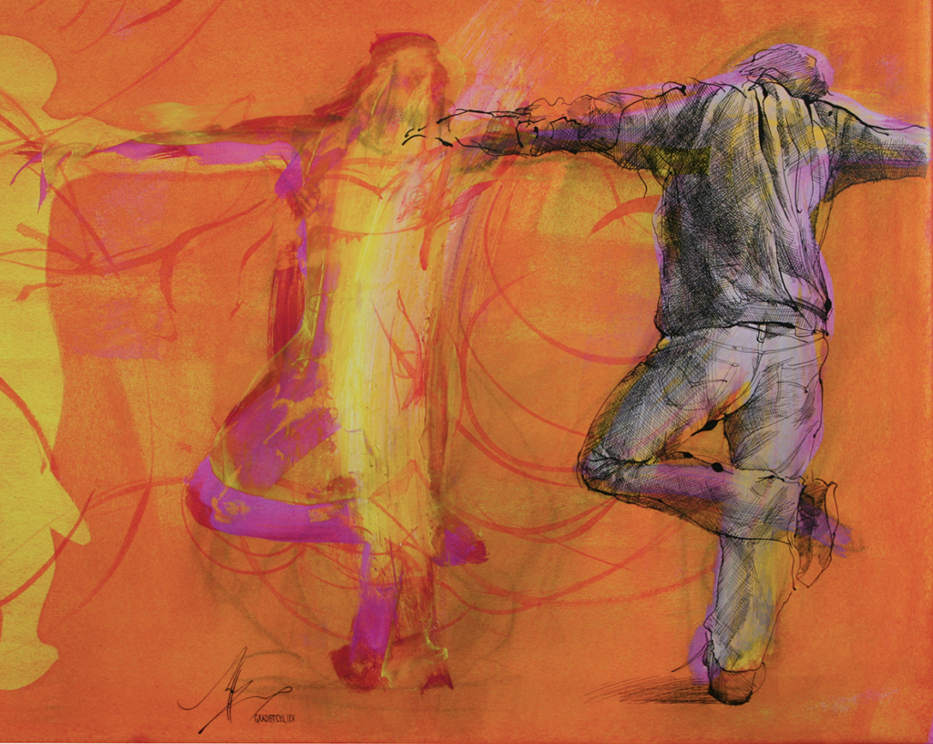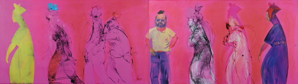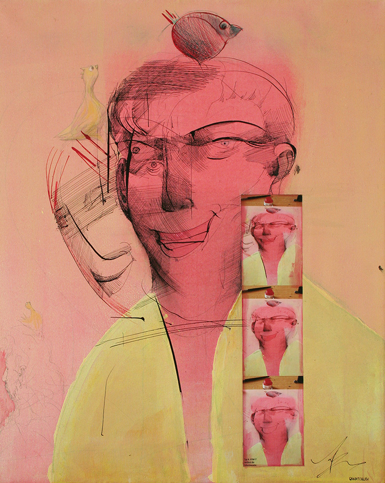 Andrey Gradetchliev hat die Zeichnung zu seiner wichtigsten künstlerisches Ausdrucksform gewählt. Sie ist das Medium, das die spontanste und direkte Verbindung zwischen Eingebung und Ausführung, zwischen Idee und Realisierung erlaubt. Er nutzt es, um Menschen zu studieren, ihre Posen zu analysieren, Befindlichkeiten zu typisieren. Damit schafft er ein wundersames und wunderbares Panoptikum und hält uns als Zeitgenossen auch einen Spiegel vor. In einer seiner Serien reiht er Figuren als Sitzende frontal auf, wie Publikum, das uns wortlos zusieht und zu Akteuren auf einer Bühne macht. Ein andermal lässt er sie in meterlang sich fortsetzenden Bildern exakt auf Linie marschieren, studiert sie beim Tanzen, lässt sich auch als Akte nebeneinander posieren, setzt ihnen in frecher Anspielung einen Vogel auf den Kopf. Seine Pointierungen treibt er gern bis an die Grenze der Karikatur. In souveräner Beherrschung der akademischen Techniken und Stilmittel kann der Künstler Volumen, Körper, Licht und Schatten in Schwarz-Weiß-Manier mit feinsten Schraffuren und Linienführungen schaffen. Doch sein wahres Temperament zeigt er in Bildern, in denen er seine Zeichnung in leuchtende Farbflächen einbettet, seine freien und reduzierenden Pinselschwünge und Federstriche übereinander setzt und so wahrlich Hintergründiges schafft: Chiffren, Figuren, Porträts scheinen im Umriss auf, wie Fragmente einer früheren Erzählung, verschmelzen mit dem Hauptmotiv und bringen den Verlauf von Zeit ins Spiel.