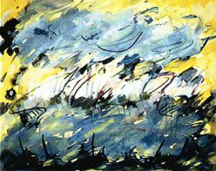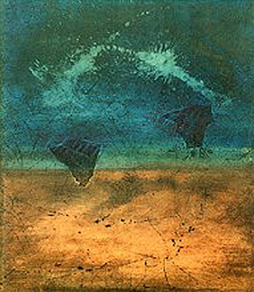 Assoziationen zu kosmischen Phänomenen und Ereignissen wecken die Acrylbilder. Man mag an Sternennebel oder Milchstraßen denken. Dort wo eine – wie immer getönte – braune Farbfläche dem Spektrum verschiedenster Blautöne bis hin wie-der zu Braun und schließlich Schwarz gegenübersteht, liegt der Gedanke an die Erdoberfläche nahe, die sich gegen das Blau der Atmosphäre vor dem Dunkel des Alls abhebt. Eruptive Strukturen zentrieren ein Bild, wobei sie Collageteile einbeziehen, wie Meteoriten vielleicht zwischen Himmel und Erde. Gewitter energetischer Linien, feiner und feinster Strukturen dunkel oder heil sich gegen Tiefen abhebend, oder im Farbnebel fast verschwimmende Collagepartikel, ein winziges Dreieck klar aufleuchtenden Blaus, provokativ die Signatur collagierten Notenpapiers, Hinweis auf die Klangstruktur des Alls, und damit auf Harmonie als der Grundstruktur dieses vibrierenden Kosmos.