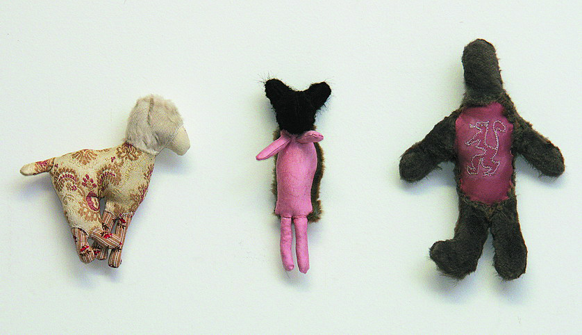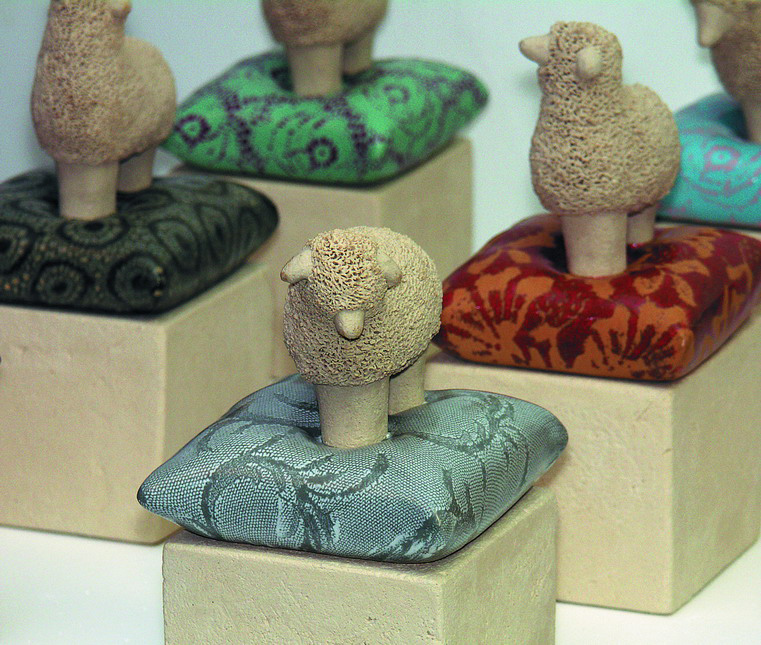 Kirsten Brünjes schafft als Bildhauerin eine Tierwelt, die ihr Aufmerksamkeit und Emotionen der Betrachter sichert. Da schweben bauchige Wesen mit dünnen Hälsen zierlich auf stacheligen Bürsten und tragen Kleider aus gemalter duftiger Spitze. Schafe stehen stur und versonnen auf scheinbar weichen Wohnzimmer-Kissen, ein goldgeschönter Kuschelhase lässt die langen Ohren schlaff hängen und hat die Arme erhoben, als sei er gerade noch geknuddelt worden. Mit souveräner Leichtigkeit und Hintergründigkeit formuliert die Künstlerin ihr Thema, das um das Tier, unser Bild vom Tier und damit auch um uns selbst kreist.